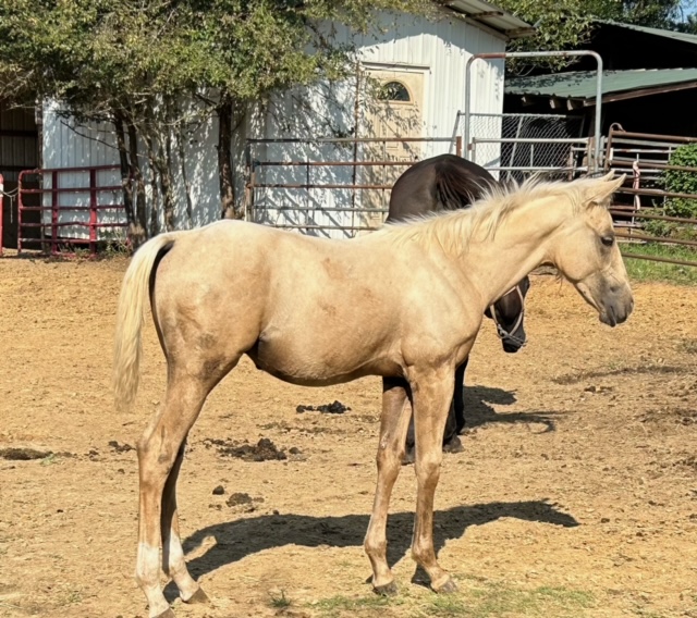 Palomino son of Quite The Party (Tres Seis, Dash Ta Fame & Firewater Flit) and out of SJ Kallies Satin (Frenchmans Guy, Martha Six Moons). Such a sweet kind baby $4500