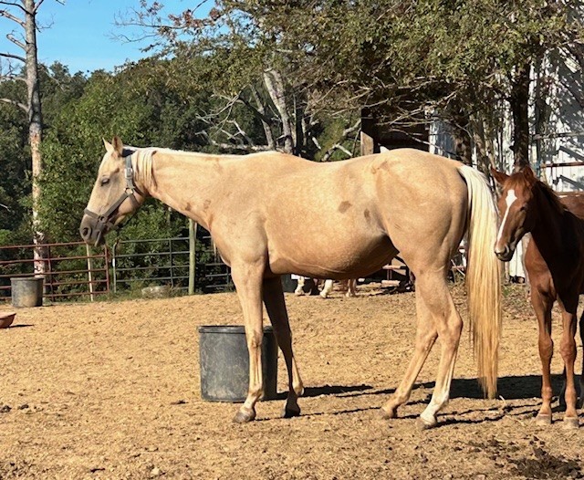 "Flit To My Lou Lou" (2012) is a daughter of French Flit by Frenchmans Guy. Shes a good looking palomino and is in foal o Vanila Tres Seis for 2026. Last Year she had a palomino filly same cross. (This foal is eligible for Ruby Buckle) $5,500